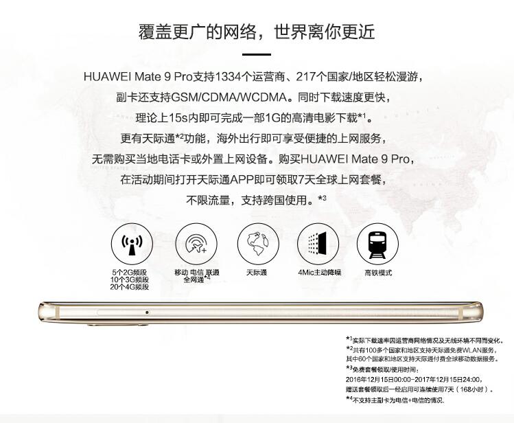 华为 Mate 9 Pro 6GB+128GB版 琥珀金 移动联通电信4G手机 双卡双待