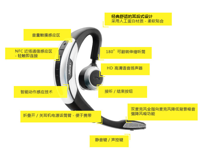 特性 全中文语音操控、智能动作感应技术、可翻转话筒臂降低风噪、近场通信技术易于连接、听力保护技术